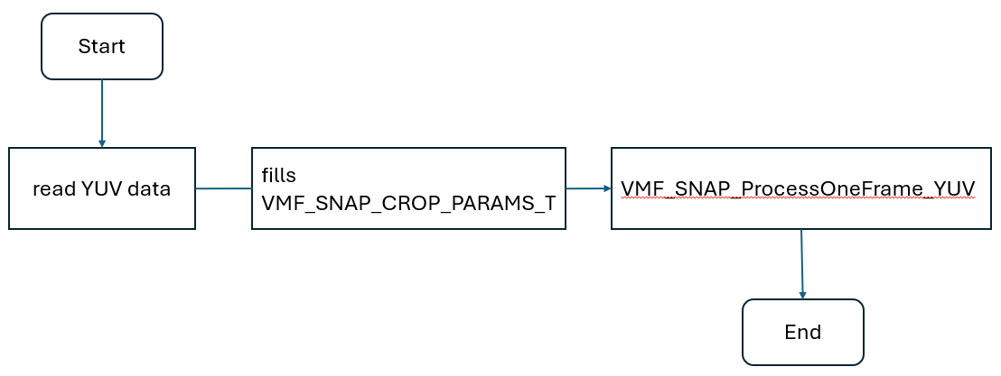 The JPEG encode sample uses VMF_SNAP_ProcessOneFrame_YUV and VMF_SNAP_CROP_PARAMS_T. It reads a YUV frame, fills VMF_SNAP_CROP_PARAMS_T with the output buffer/size, crop rectangle (dwStartX, dwStartY, dwCropWidth, dwCropHeight), and quality (dwQp), then calls VMF_SNAP_ProcessOneFrame_YUV(ssm, &crop) to encode. On success, the function returns the JPEG size (bytes) and writes the encoded image into pOutBuffer.